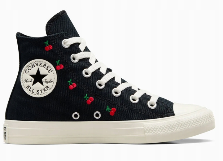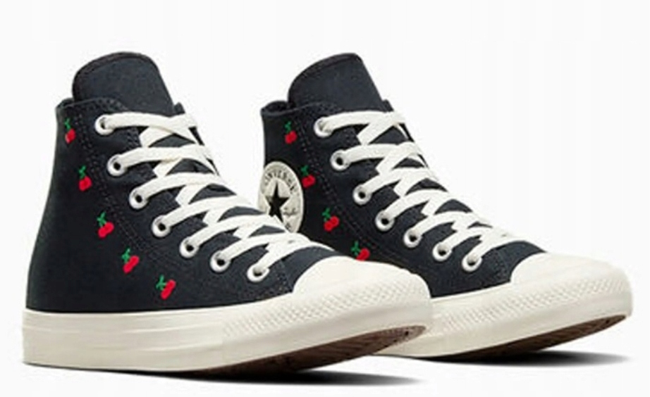 Model trampek Chuck Taylor w nowej odsłonie. Wysoka cholewka z materiału, przyciąga uwagę i nadaje stylowego charakteru. Podeszwa środkowa z pianki EVA dba o miękkość i amortyzację każdego kroku. Sznurowanie zadba o dobre dopasowanie obuwia do stopy. Klasyczna gwiazdka producenta umieszczona na kostce to nie tylko znak rozpoznawczy, ale także gwarancja jakości i stylu. Model ten dodatkowo ozdobiono uroczym wzorem z wiśniami.